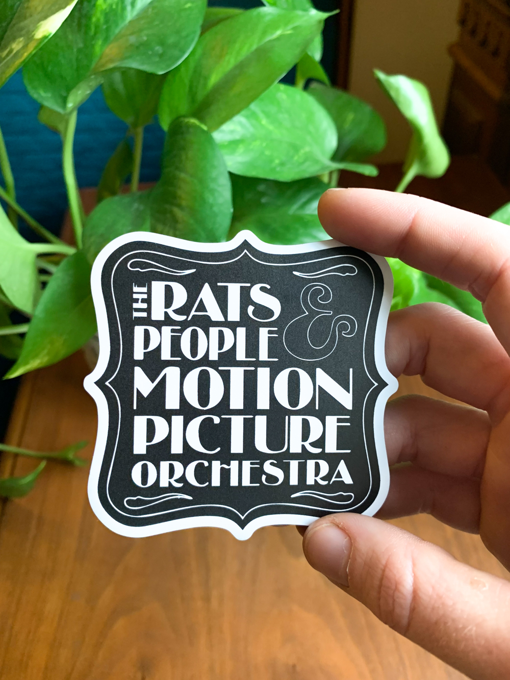 • Small, white cello rat sticker held in front of a green viney plant